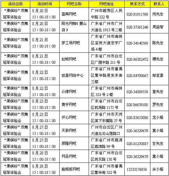 “果缤纷”双舞冠军挑战赛是对参与20场网吧试玩的玩家,进行现场成绩记录和排序,每名玩家只有一次参与活动的机会,让有实力的劲舞、超舞玩家都有机会来挑战冠军,赢取奖励,对于两款游戏排名在前15位的玩家,将在8月30日聚集一堂,参与最终的双舞冠军会及“冠军之夜”网聚。