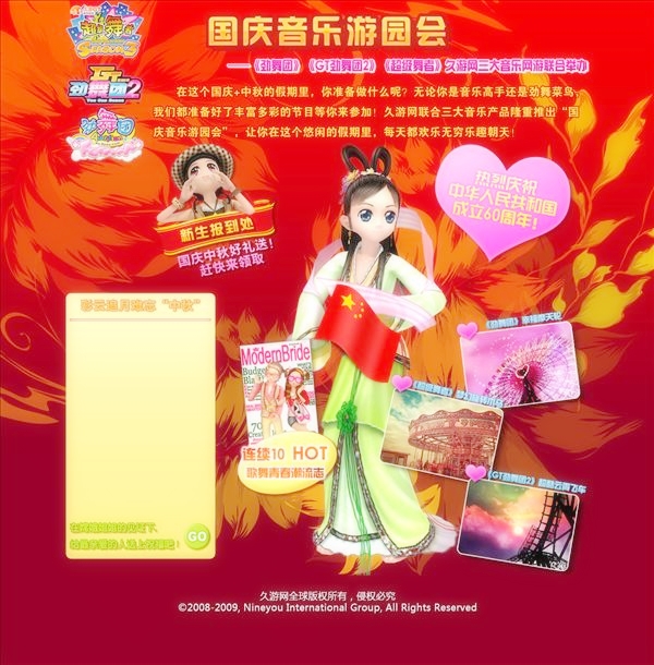 金秋10月,祖国将迎来60华诞,举国同庆的欢乐与祥和气氛让整个世界为之欢呼雀跃。我们用音乐唱出心中的祝福之歌,用舞蹈跳出无以言表的真挚感情。久游《劲舞团》《超级舞者》《GT劲舞团2》三大音乐网游联合举办的“国庆音乐游园会”隆重登场,为你们的假期带来缤纷多样的活动,玩转充满喜庆的黄金周!对于舞蹈菜鸟的你,我们送上超值的入门好礼,新生的舞蹈人生将绚丽开启!对于舞界达人的你,我们更是赋予你挑战极限的绝佳机会,让自己的舞技不断提升,成为万众瞩目的闪亮明星!红色的气球承载着几亿人的梦想与祝愿,慢慢升起,飘过全国的大街小巷,飘过你所在的上空。欢快动感的音乐正在响起,活跃你的手指,绚丽的舞台幕布已经徐徐打开……