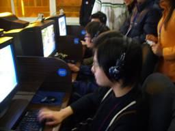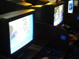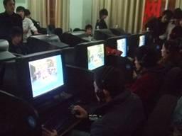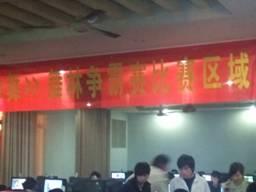 网管帅哥挑选了最好的位置悬挂本次活动的宣传横幅,赛前选手们正在熟悉网吧的机器,进行热身